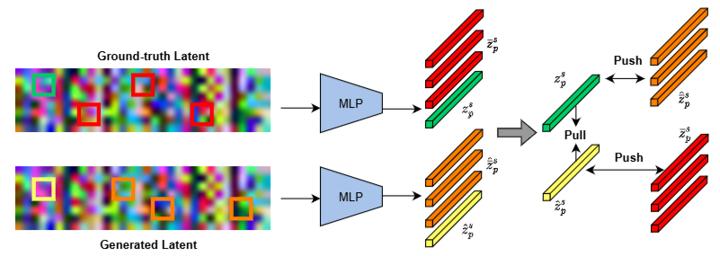 Latent Patch Contrastive Enhancement ($L_{LatentPCE}$): A multi-scale patch-based objective that aligns generated and target features to sharpen local details and ensure visual consistency.