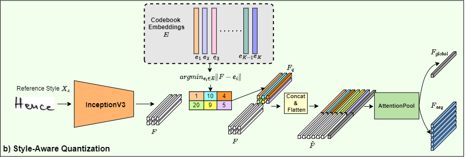Style-Aware Quantization (SAQ): A module that represents handwriting as discrete visual tokens (“style concepts”), allowing the model to capture core stylistic traits while ignoring incidental noise.
