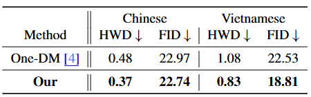 - Multilingual Adaptability: Demonstrated over 10% improvement in HWD scores for Chinese and Vietnamese scripts compared to previous state-of-the-art models like One-DM.